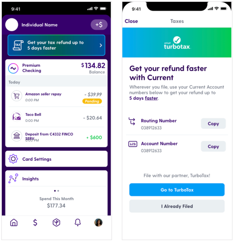 With Current, you can get your tax refund up to five days faster with direct deposit to your Current Premium Account. With our partnership with TurboTax, simply login to your Current account, click on the “Go to TurboTax” button to set up your e-file account, and have your Current routing and account numbers handy when filing.